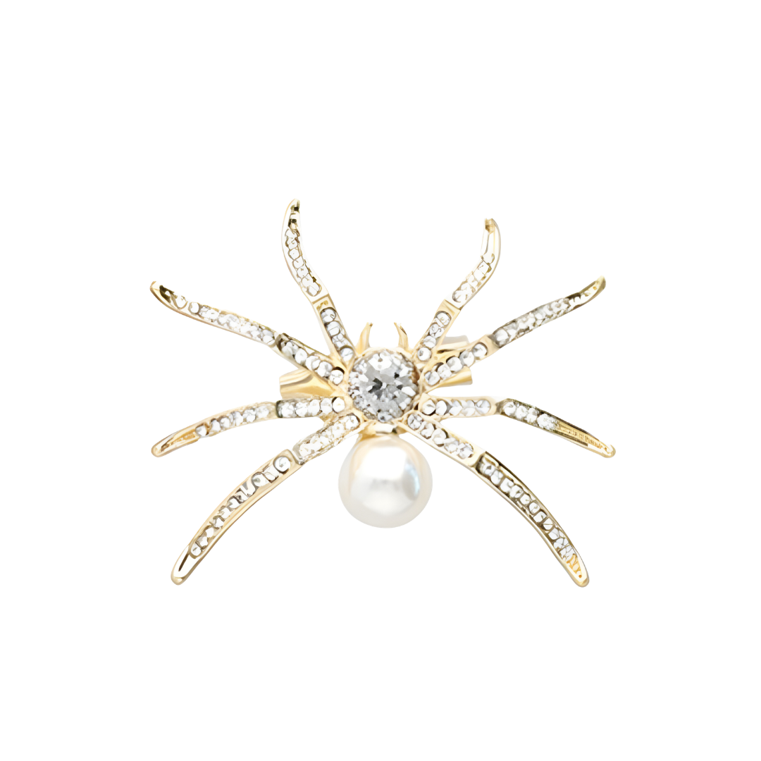 HVID EDDERKOP balancerer det sarte og det dramatiske. Den har en hvid perlekrop og fine hvide sten på benene, så den både glimter og har kant. Den er lidt “don’t mess with me”, men stadig elegant.