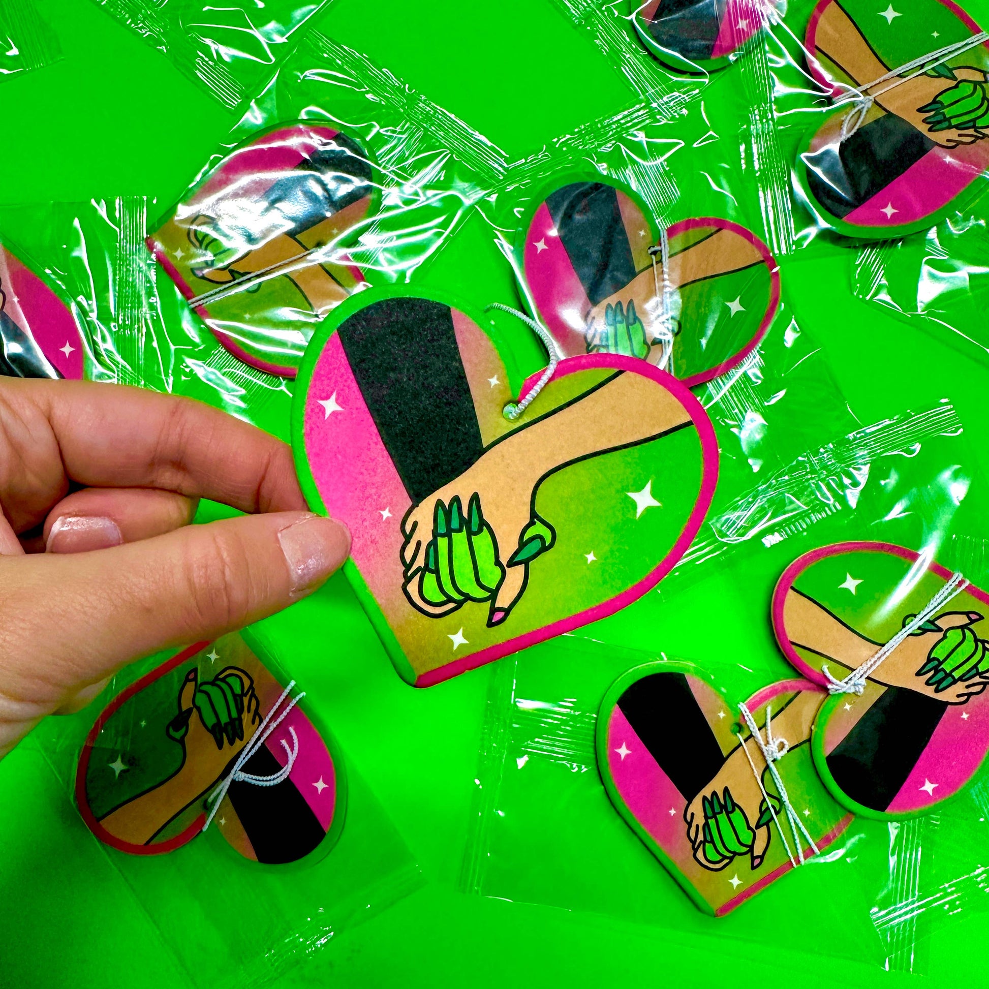 Pink & Green Witches er en Wicked inspireret duftfrisker til dig, der elsker drama, musical vibes og lidt witchy energi i hverdagen. Motivet med de pink og grønne hænder, der holder hinanden, siger det hele.